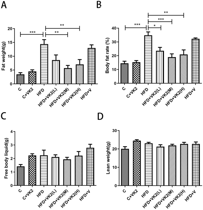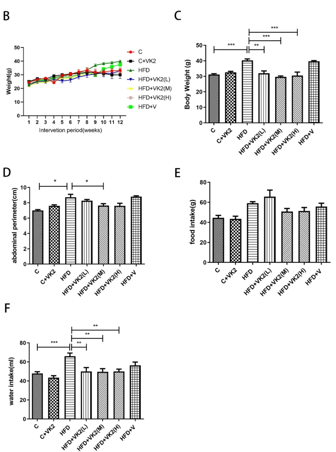 然而,維生素 K2 干預組與高脂飲食組之間體液與瘦體質量無顯著差異(圖 2C 和 2D)。這些結果表明,維生素 K2 在減少脂肪積累方面具有顯著效果,且不影響瘦體質量與體液的分佈。