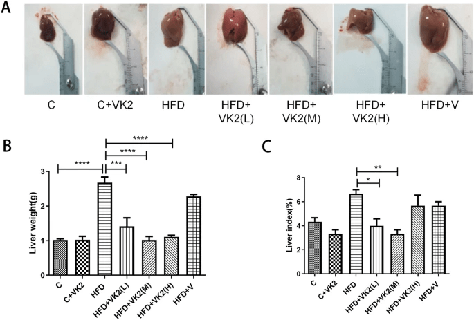 所有對照組小鼠餵養 標準飼料,而 NAFLD 小鼠則餵養 高脂飲食。高脂飲食成分為 每 100 g 含蛋白質 26.2 g、碳水化合物 26.3 g、脂肪 34.9 g(由江蘇協同製藥生物工程有限公司提供)。不同劑量組的小鼠每天與飼料一起餵食 VK2,持續 8 週。VK2 以 大豆油溶解 並經灌胃給藥。成功建模的標準包括: