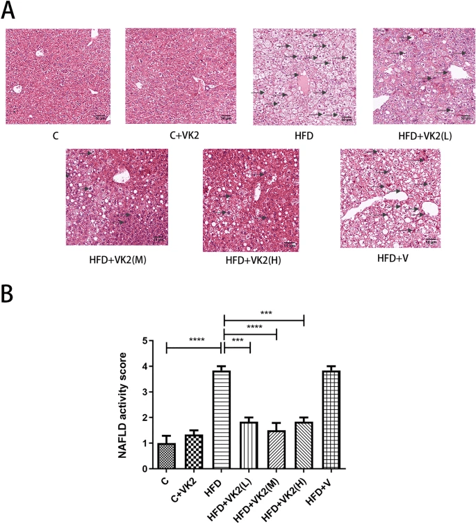 本研究結果表明,維生素 K2 對高脂飲食誘導的非酒精性脂肪肝(NAFLD)具有顯著的保護作用。