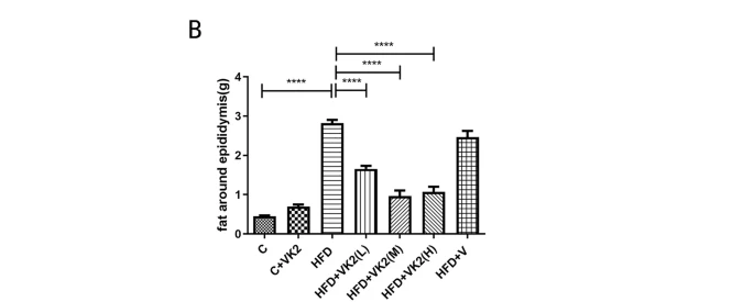 本研究結果顯示,NAFLD 小鼠體型更大,且顯著肥胖,而接受維生素 K2 干預的小鼠則可有效控制體型(圖 1A)。此外,我們發現,預防性補充維生素 K2 不僅減少了肉眼可見的肝臟脂肪變性,還顯著降低了內臟脂肪積累(圖 4)。一項隨機對照試驗(RCT)證實了我們的發現,即 高維生素 K2 攝取有助於降低體重、腹部脂肪與內臟脂肪,尤其在絕經後女性中效果顯著。
